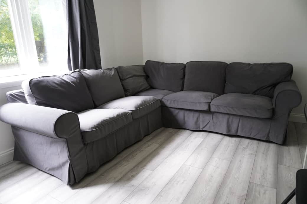 The living area contains a stylish corner sofa, television, dining table with chairs alongside a kitchenette with fridge, freezer, cooking facilities and tea and coffee provided.